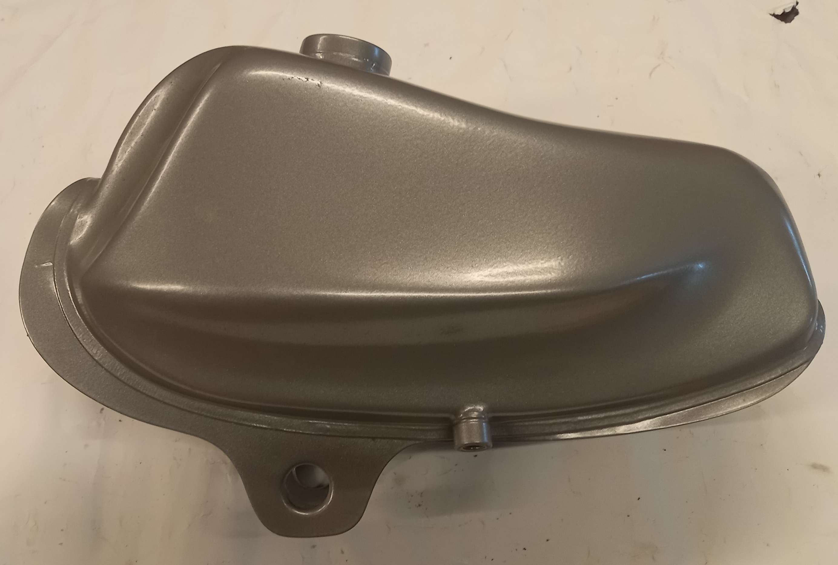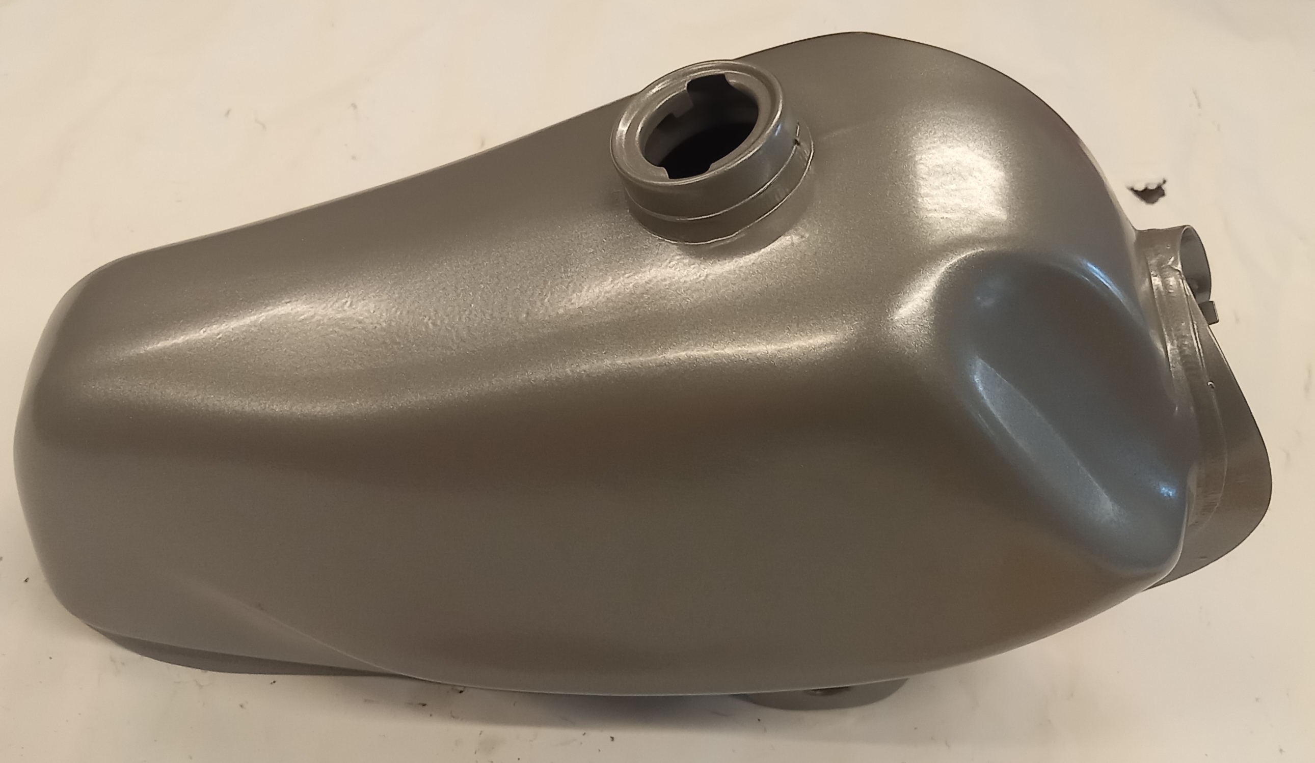 Benzintank aus Stahl, neu, in grauer, eher matter Farbe zu Pony Cross. Der Benzintank wurde anlässlich einer Werbung für Pulverbeschichtung neu gekauft und pulverbeschichtet. Danach wurde er gelagert und vergessen. Im Inneren hat es normale leichte Spuren von Flugrost, den man lassen kann. Auf Wunsch kann ich aber die Innenseite, kostenpflichtig, etwas sandstrahlen.Falls man die Farbe selber ändern will, den Tank mit einem Schleif -Pad leicht anschleifen und zB. mit einer Spraydose in mehreren Durchgängen neu lackieren.