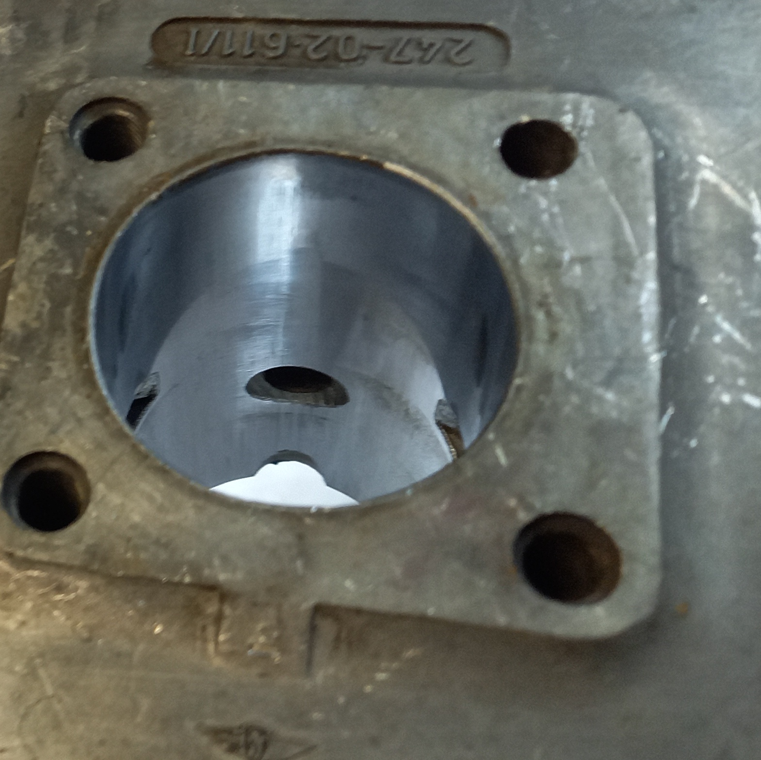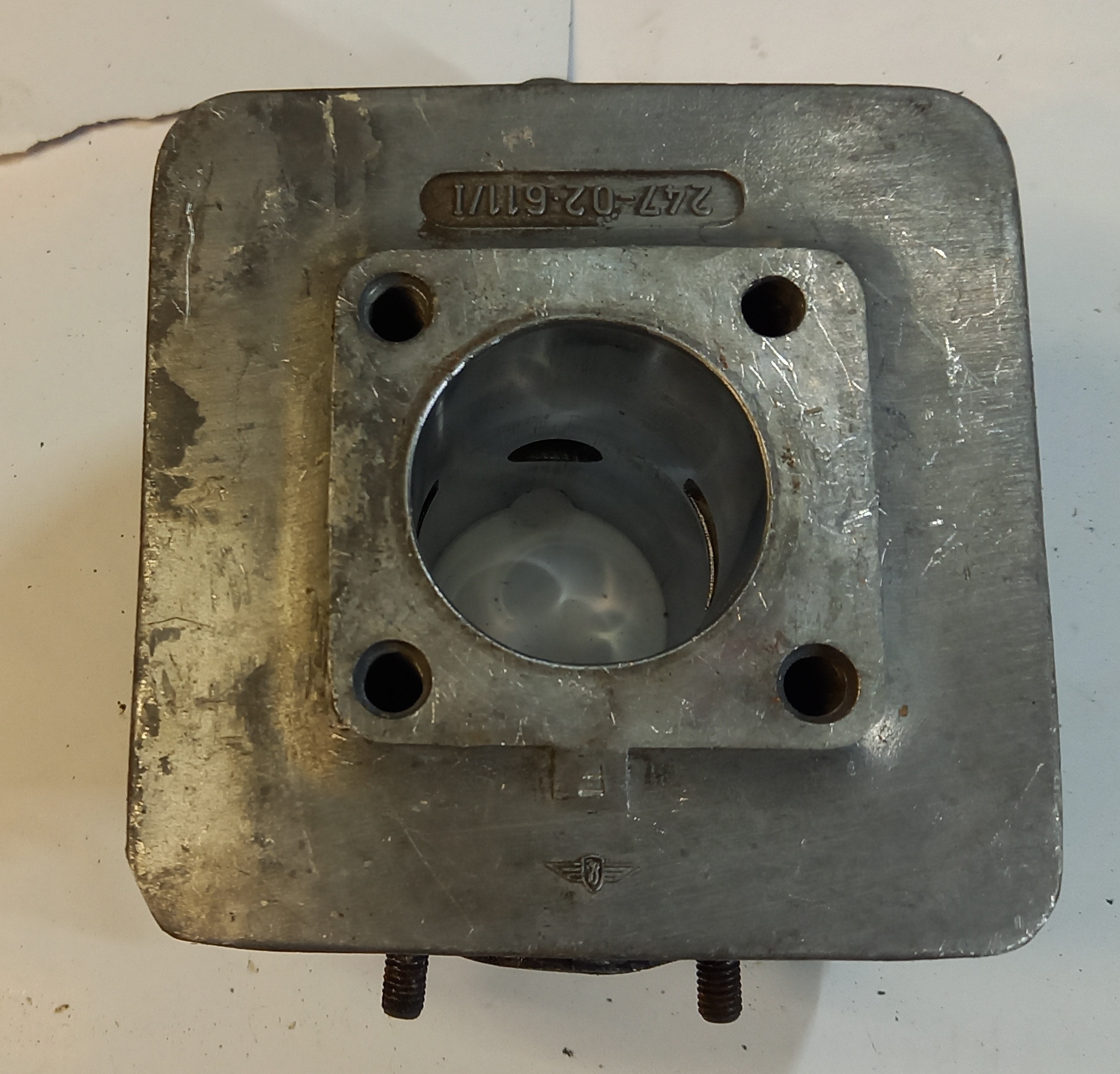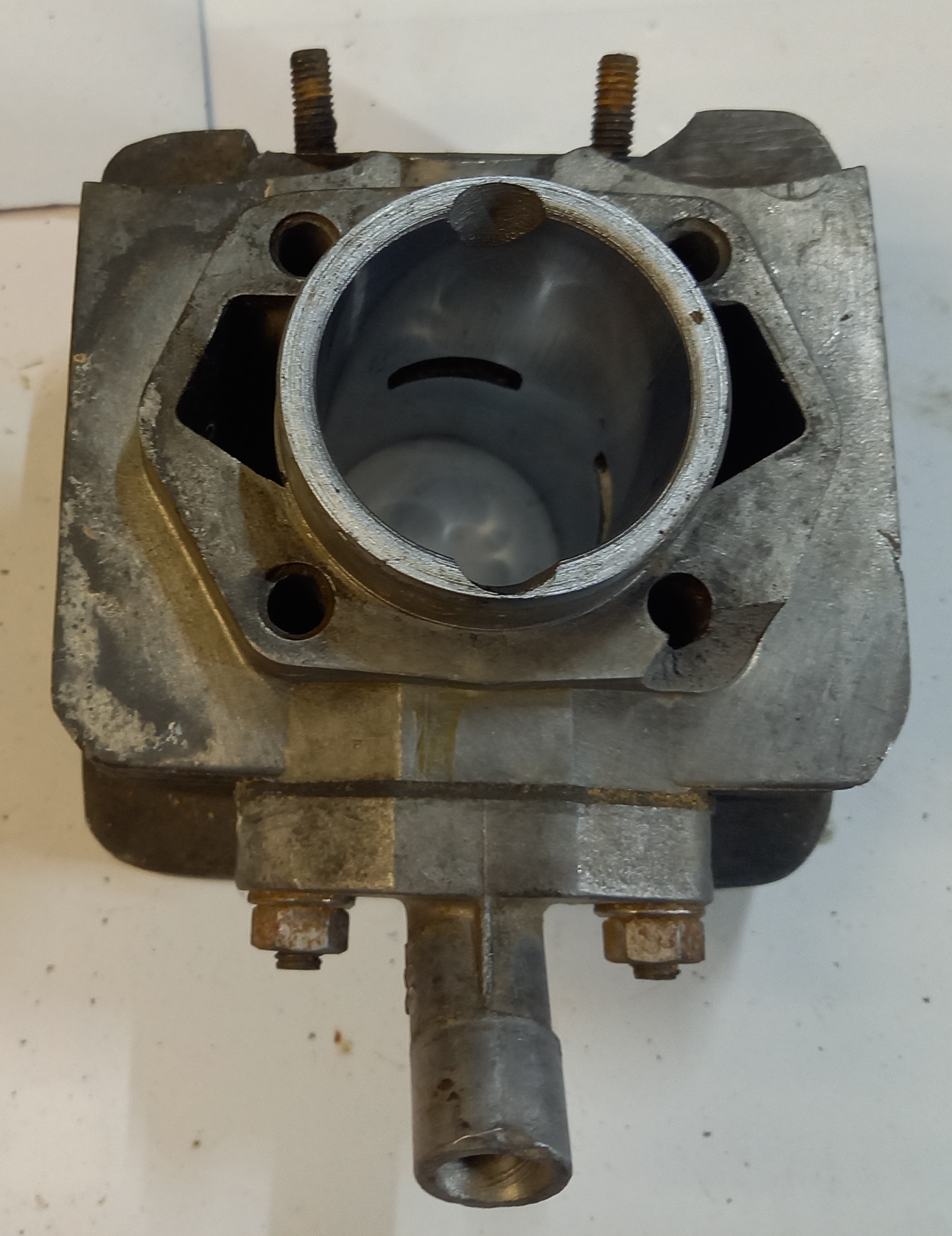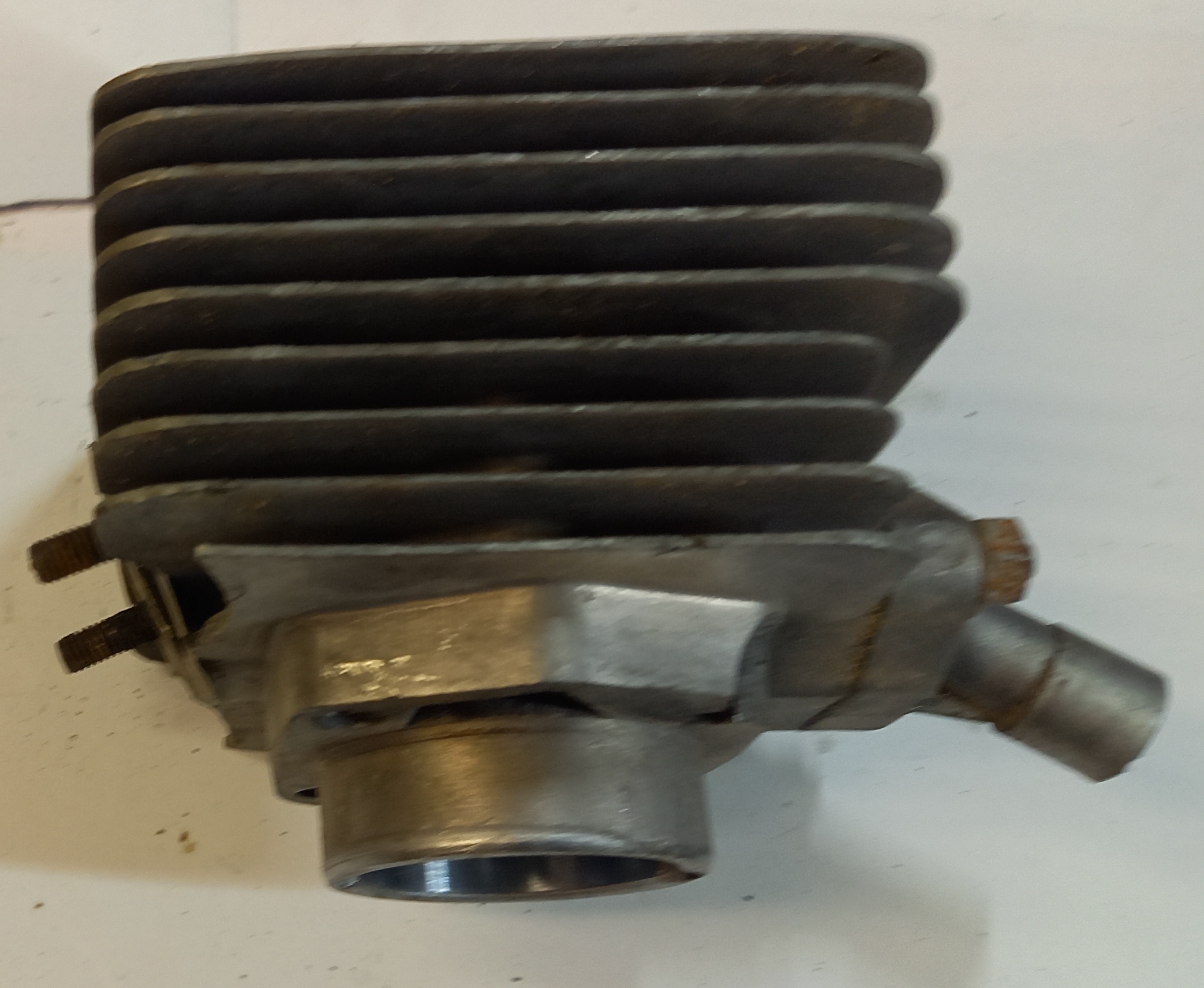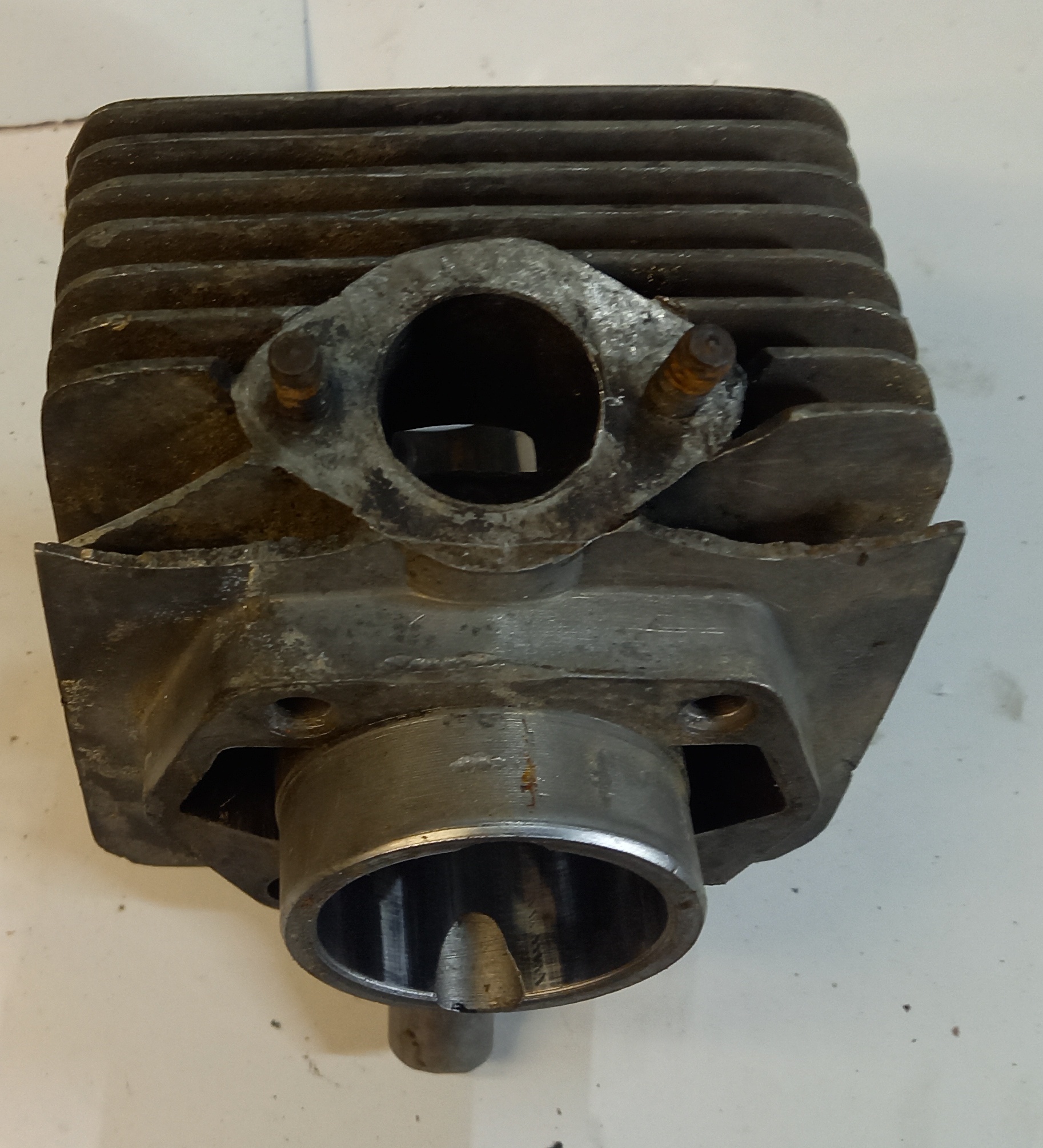 Original Zylinder Zündapp Belmondo Handschaltung mit Ansaugstutzen. Occasion aus altem Lagerbestand. Die Lauffläche des Kolbens ist sehr schön. Leider ist unten am Zylinderfuss ein Teil ausgebrochen. Das ist meiner Meinung nach aber kein Problem, weil dort keine Dichtfläche ist. Und die Auflage ist gross genug, dass der Zylinder einwandfrei angezogen werden kann.
