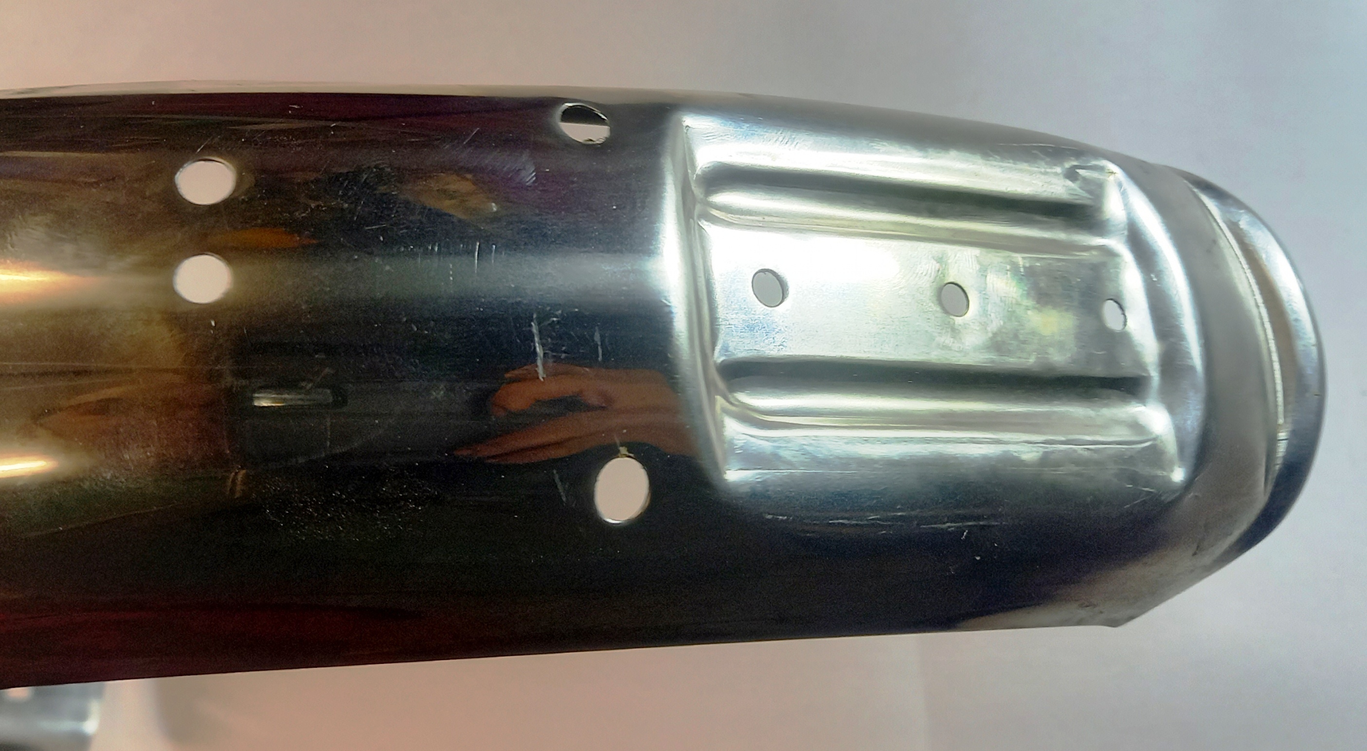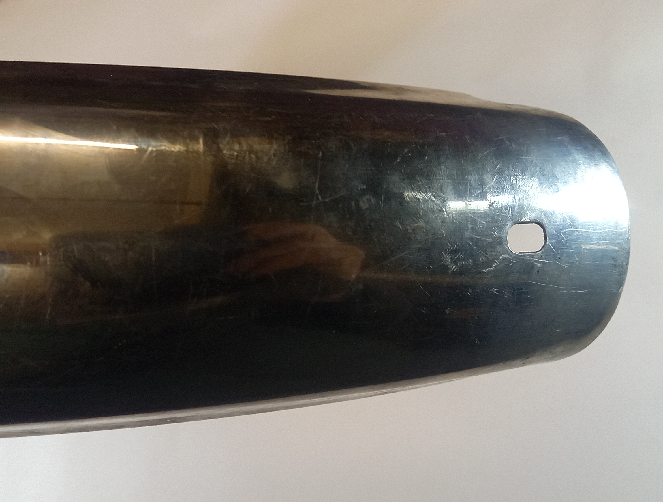 Schutzblech hinten für 23 Zoll Räder, NOS. Wurde vermutlich an Sachs Mofas verbaut. Originales und neues Schutzblech aus altem Lagerbestand mit kleinen Lagerspuren. Runde Ausführung ohne Kanten, ähnlich wie bei Puch Sport NS und NL und Puch 2 Gang Automat 2 AH.