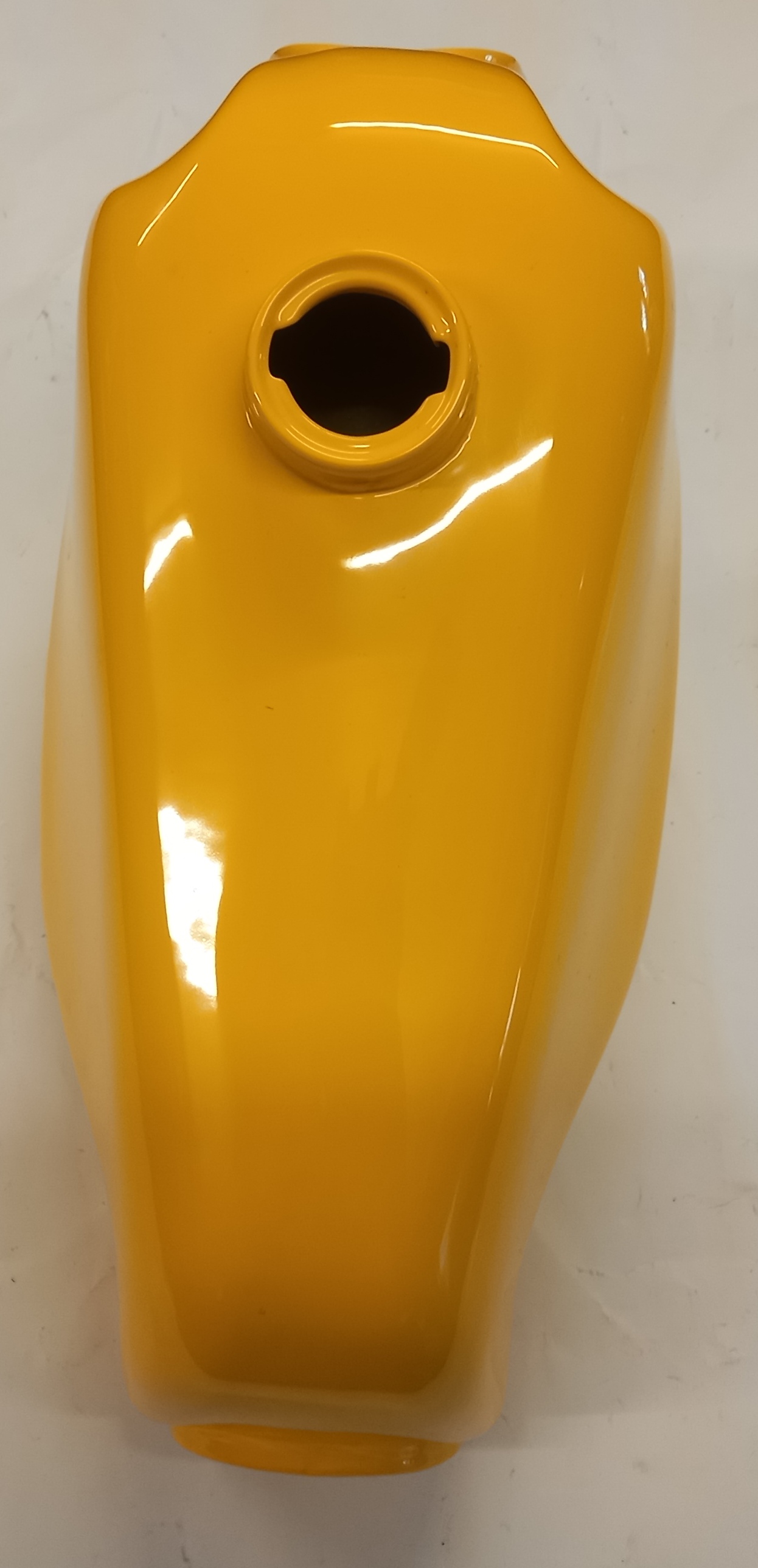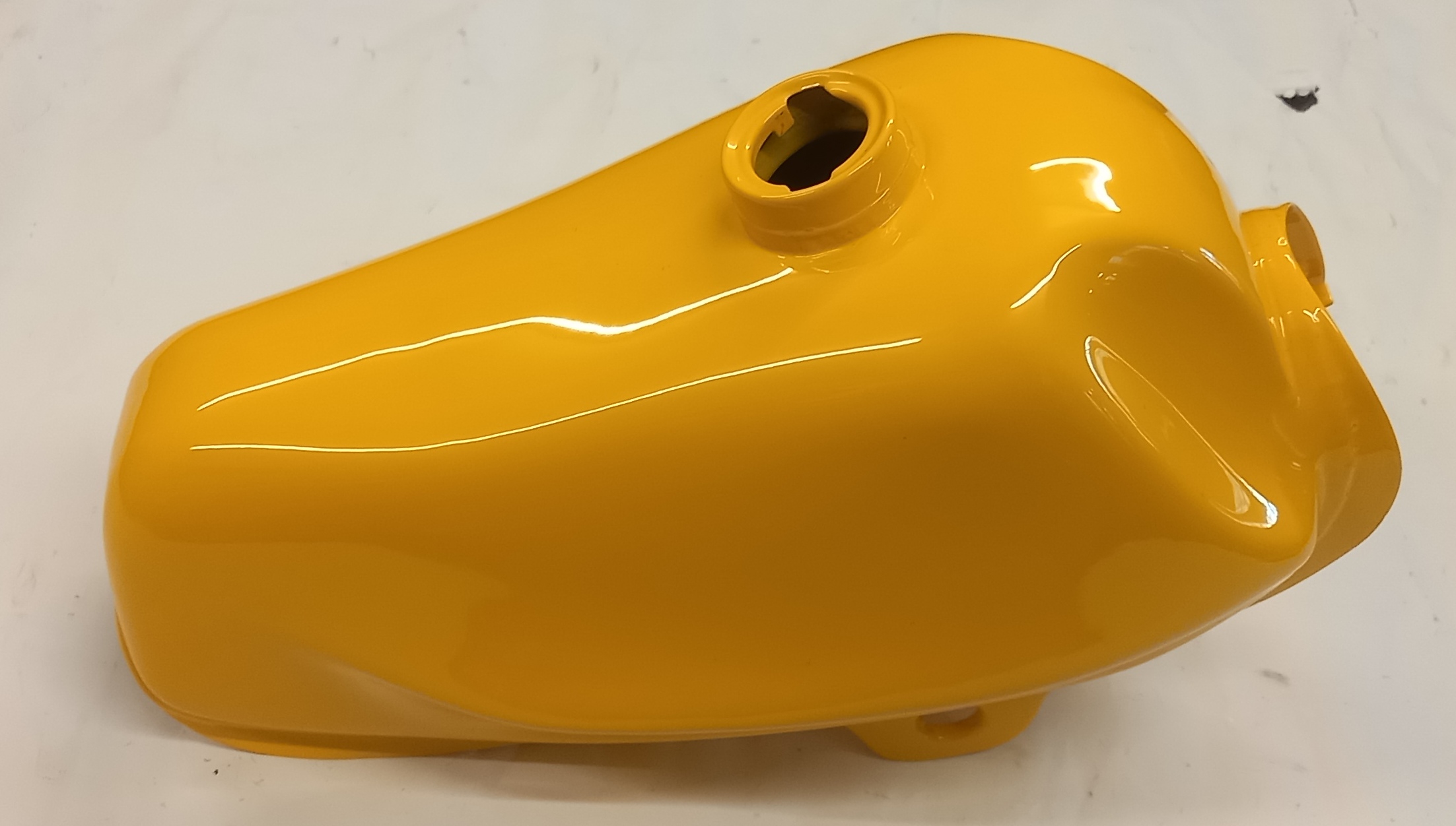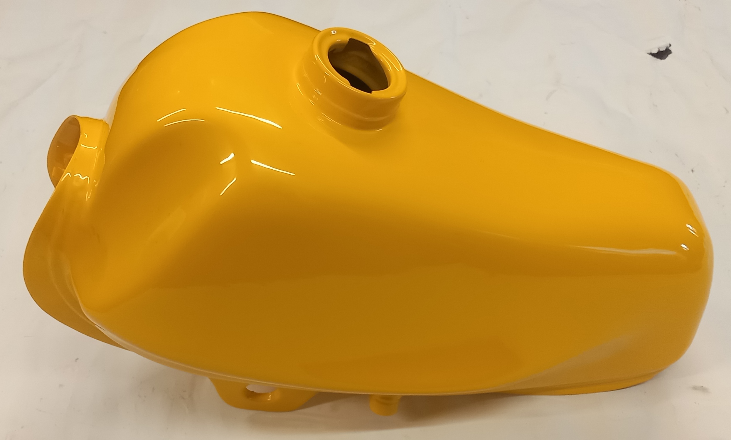 Benzintank aus Stahl, neu, in gelber Farbe zu Pony Cross. Der Benzintank wurde anlässlich einer Werbung für Pulverbeschichtung neu gekauft und pulverbeschichtet. Danach wurde er gelagert und vergessen. Im Inneren hat es normale leichte Spuren von Flugrost, den man lassen kann. Auf Wunsch kann ich aber die Innenseite, kostenpflichtig, etwas sandstrahlen. Heute kostet ein fabrikneuer, original lackierter Tank, ca. 180 Fr.-