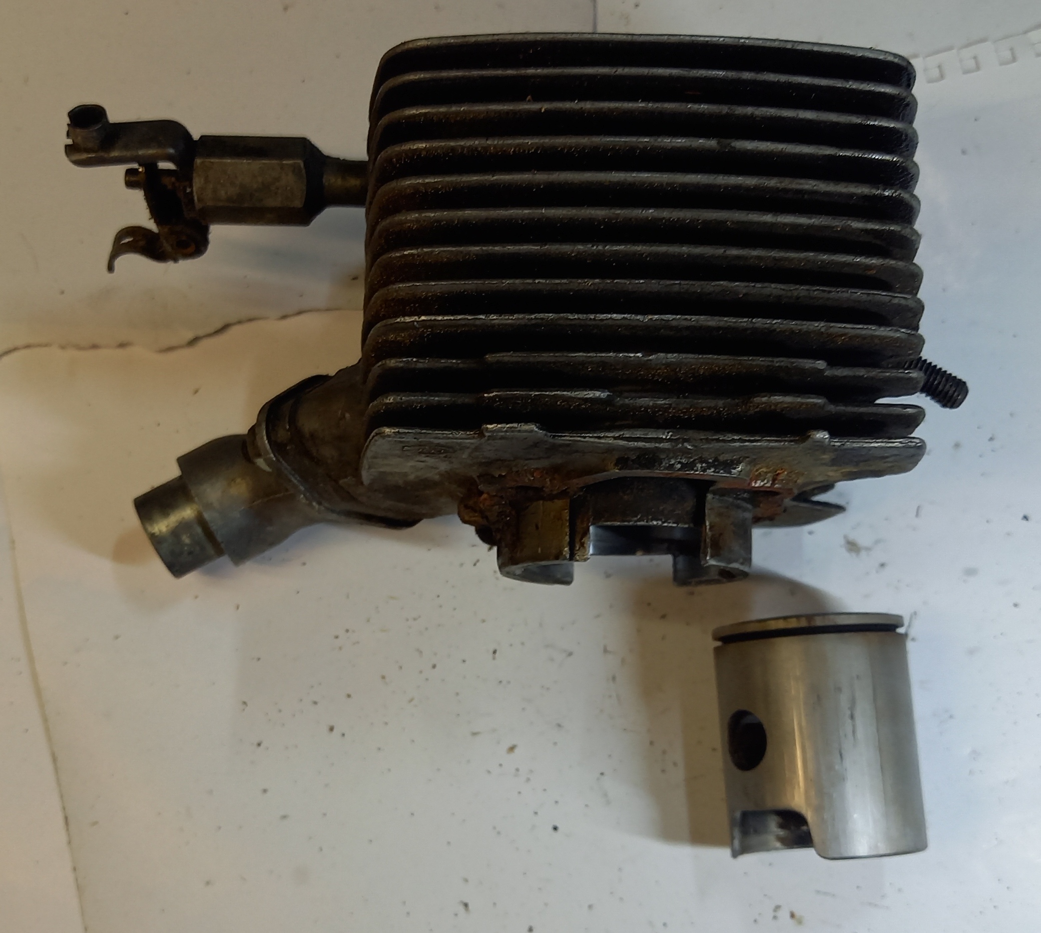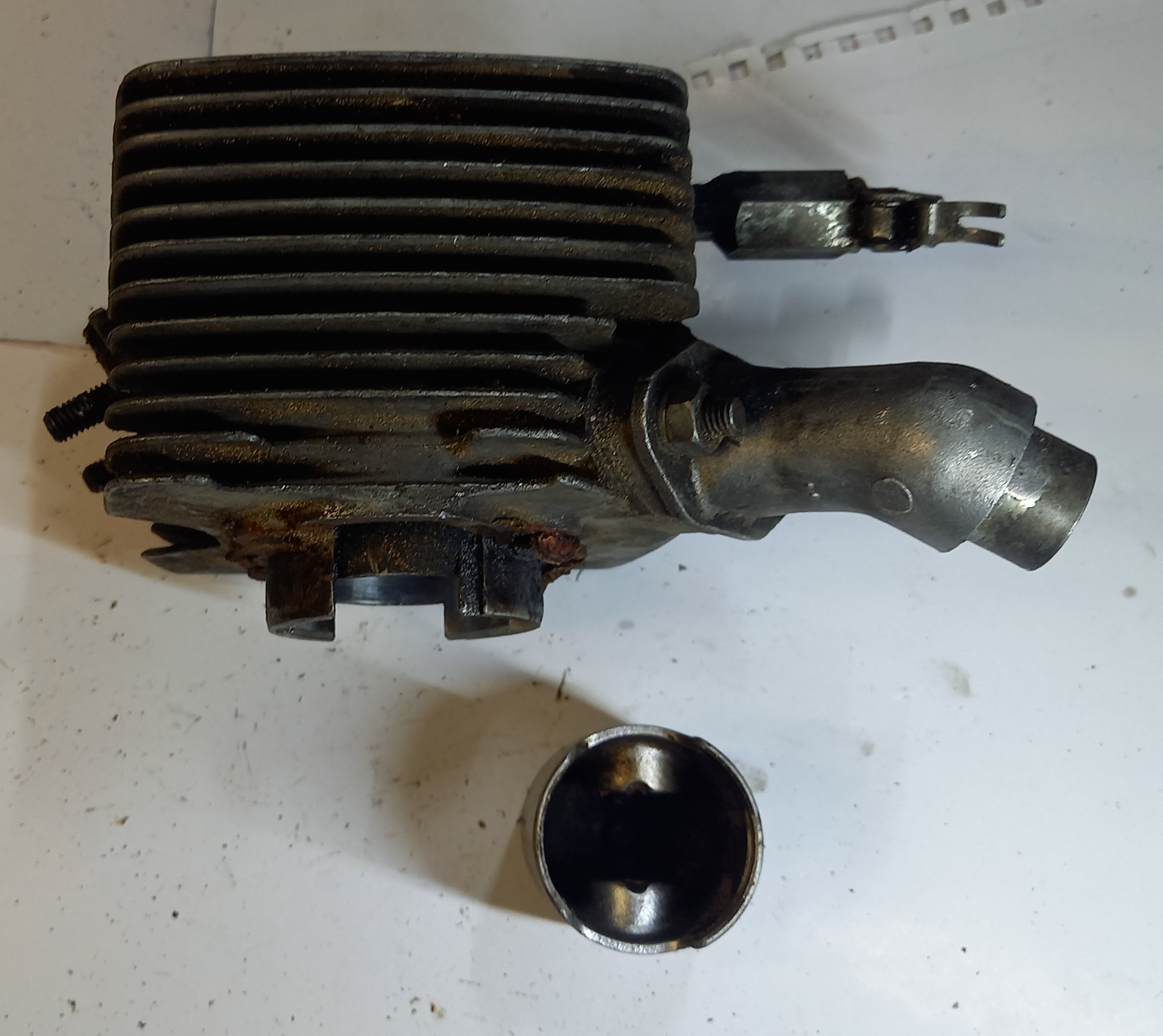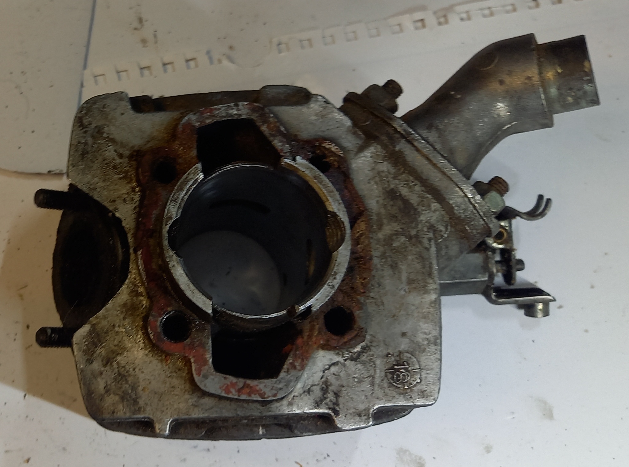 Original Zylinder zu Zündapp ZR 30 2Gang Automat, Occasion. Inklusive Ansaugstutzen, Dekompressor und Kolben. Aus altem Lagerbestand. Fläche im Verdichtungsbereich ist gut. Siehe Fotos