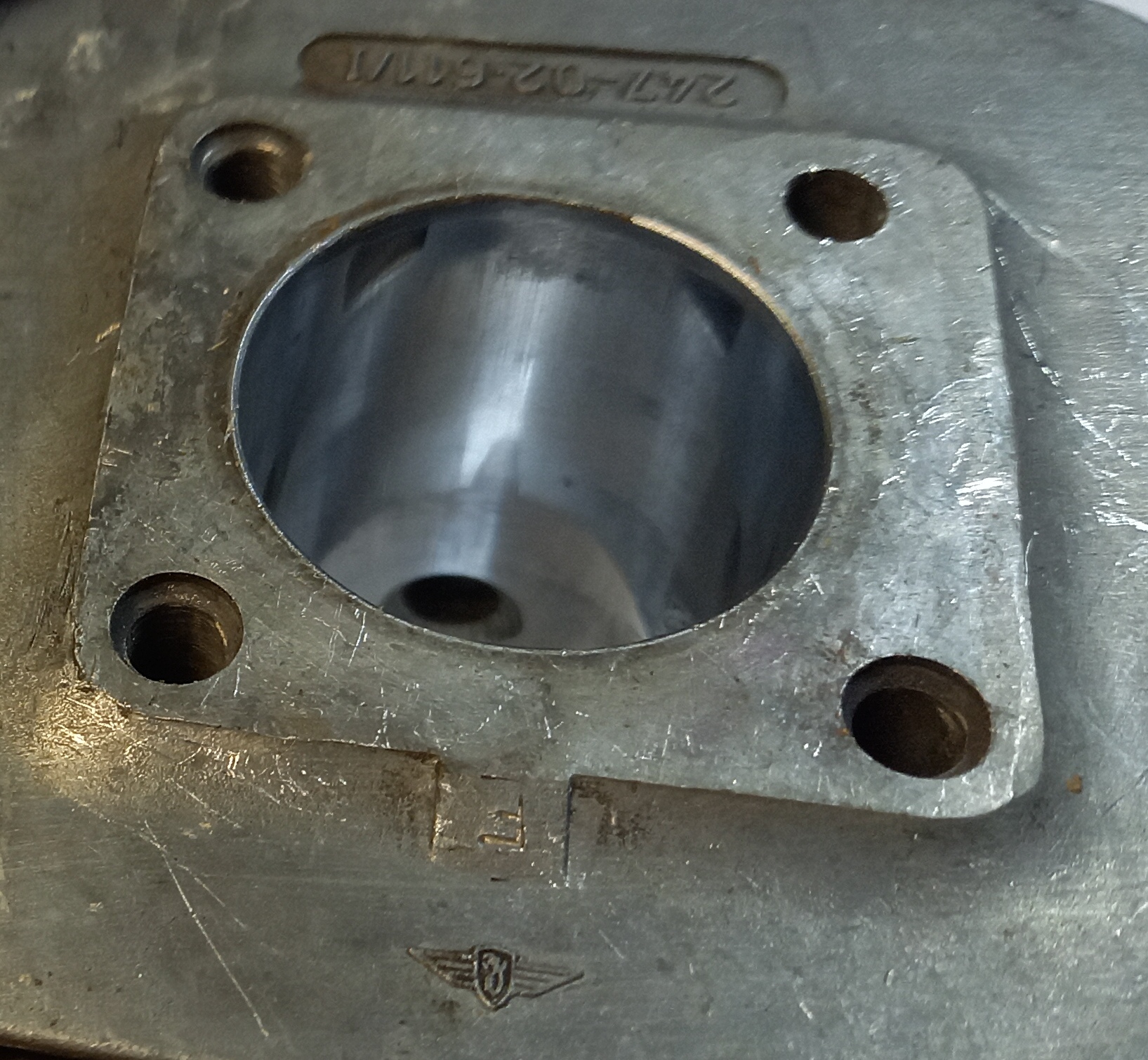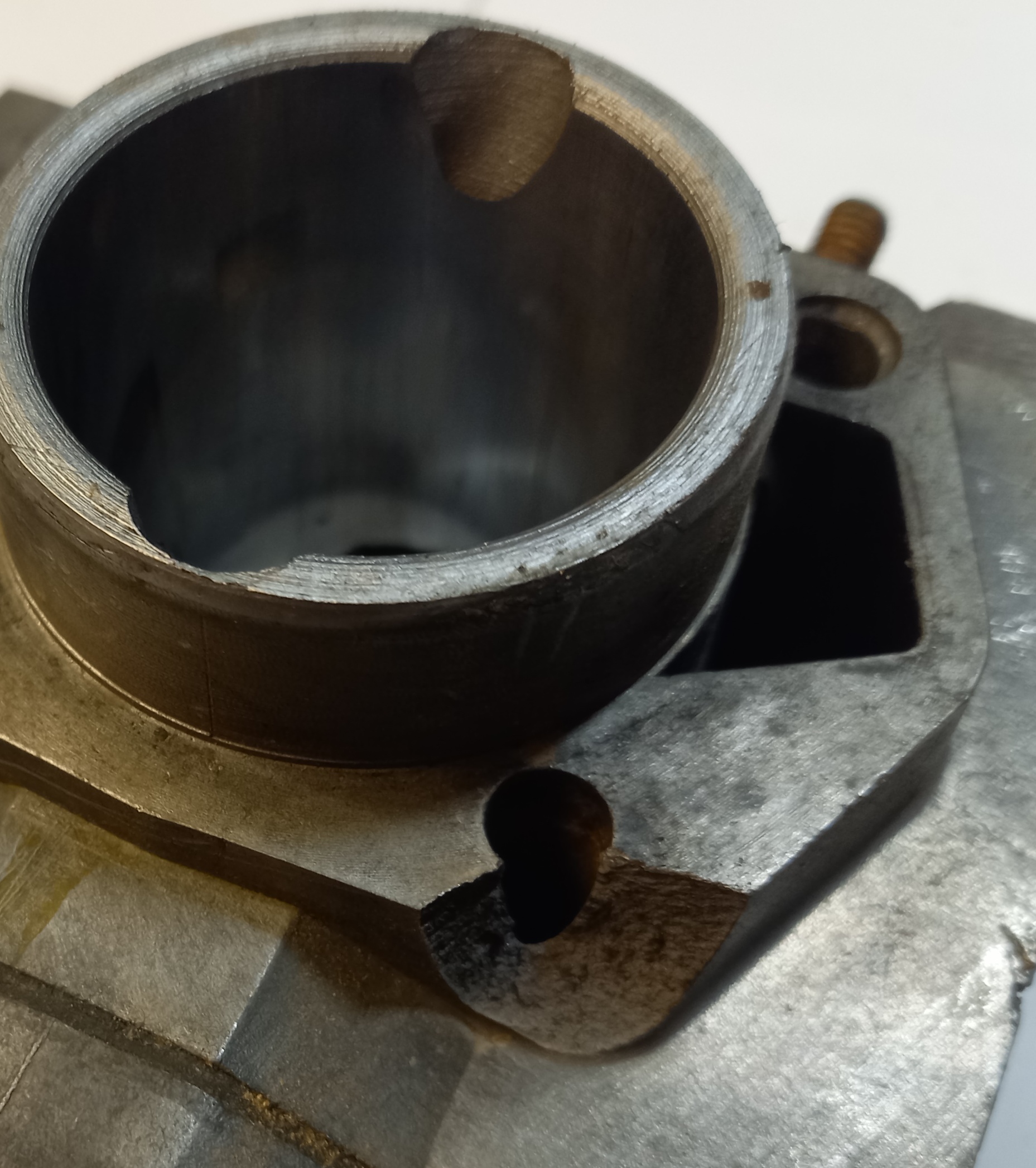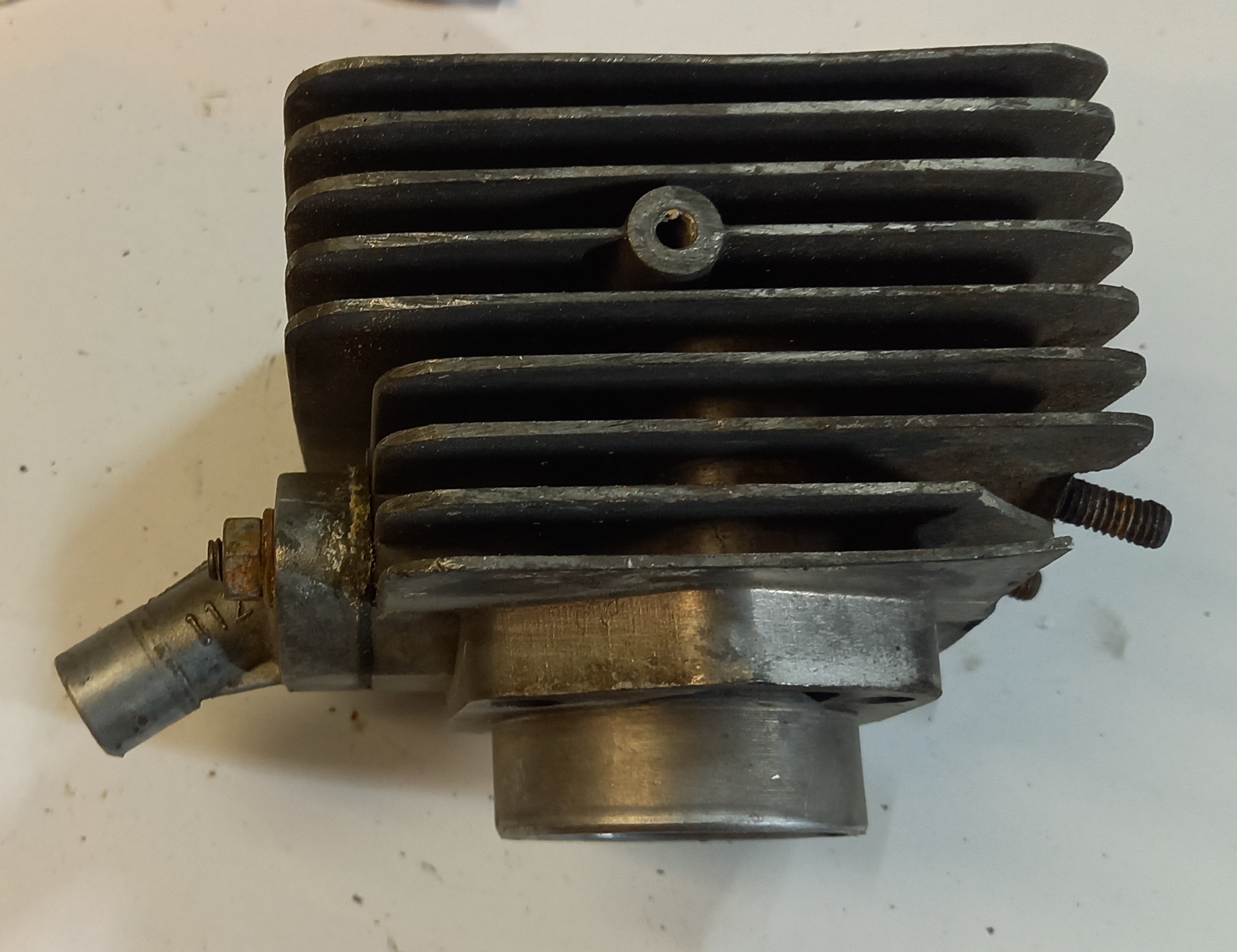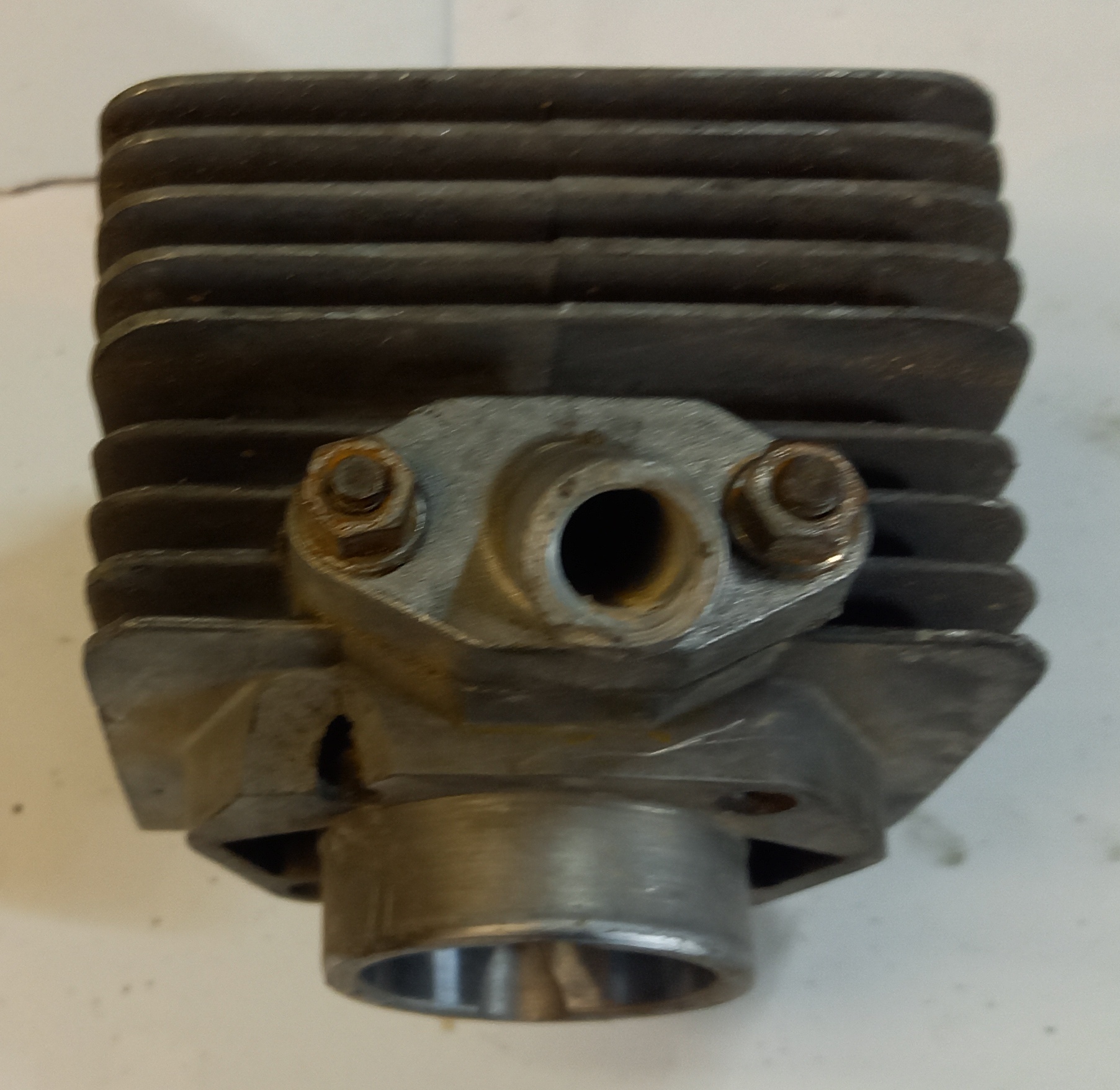 Original Zylinder Zündapp Belmondo Handschaltung mit Ansaugstutzen. Occasion aus altem Lagerbestand. Die Lauffläche des Kolbens ist sehr schön. Leider ist unten am Zylinderfuss ein Teil ausgebrochen. Das ist meiner Meinung nach aber kein Problem, weil dort keine Dichtfläche ist. Und die Auflage ist gross genug, dass der Zylinder einwandfrei angezogen werden kann.